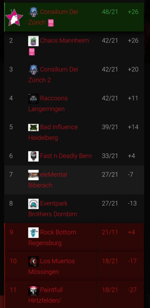Consilium Dei 2 lieferte eine sehr starke DPL ab. Man konnte leider die letzten Ergebnisse nicht mehr so realisieren wie gewünscht, somit sah man sich nach 20 Spielen im letzen Spiel, gegen das Schwesterteam um den Platz 1, konfrontiert.